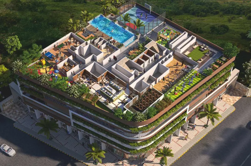 The project includes a clubhouse, swimming pools, gym, yoga room, indoor games, mini theatre, multipurpose hall, children’s play area, multipurpose court, and extensive rooftop amenities like a sky gazing deck and party lawn.