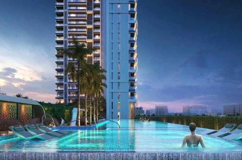 The project features a large 43,000 sq. ft. Grand Clubhouse and over 50 amenities, including a lap pool, modern gymnasium, spa, squash/tennis courts, and integrated High Street Retail.